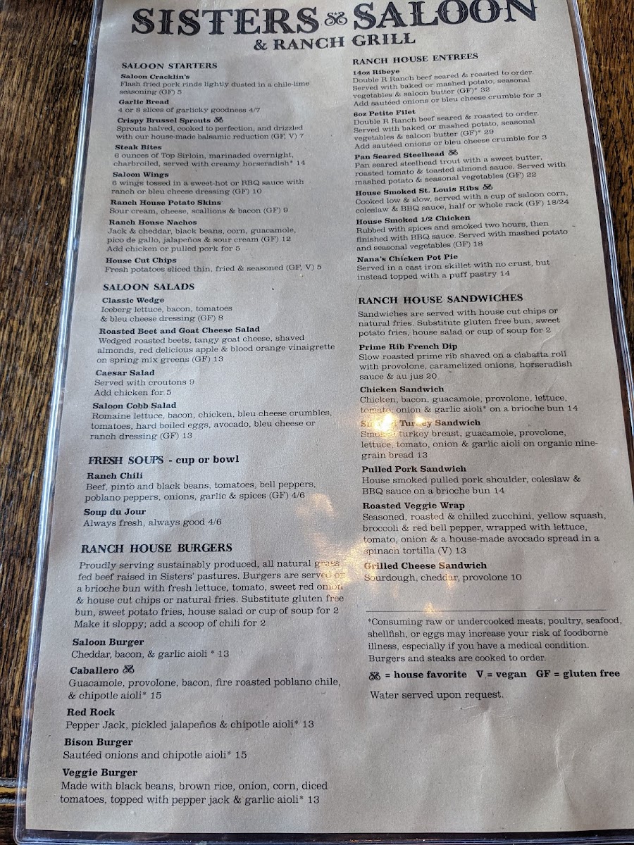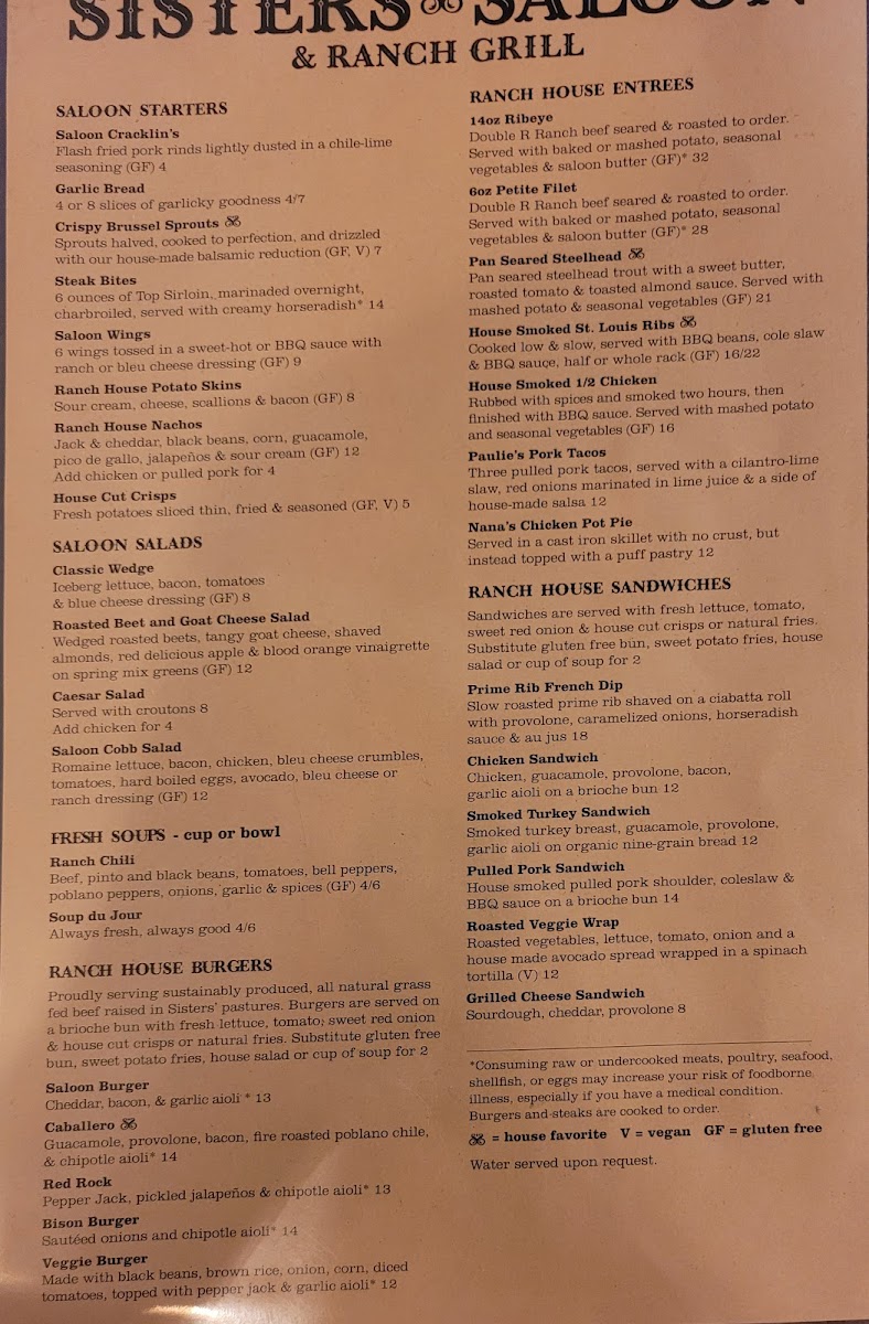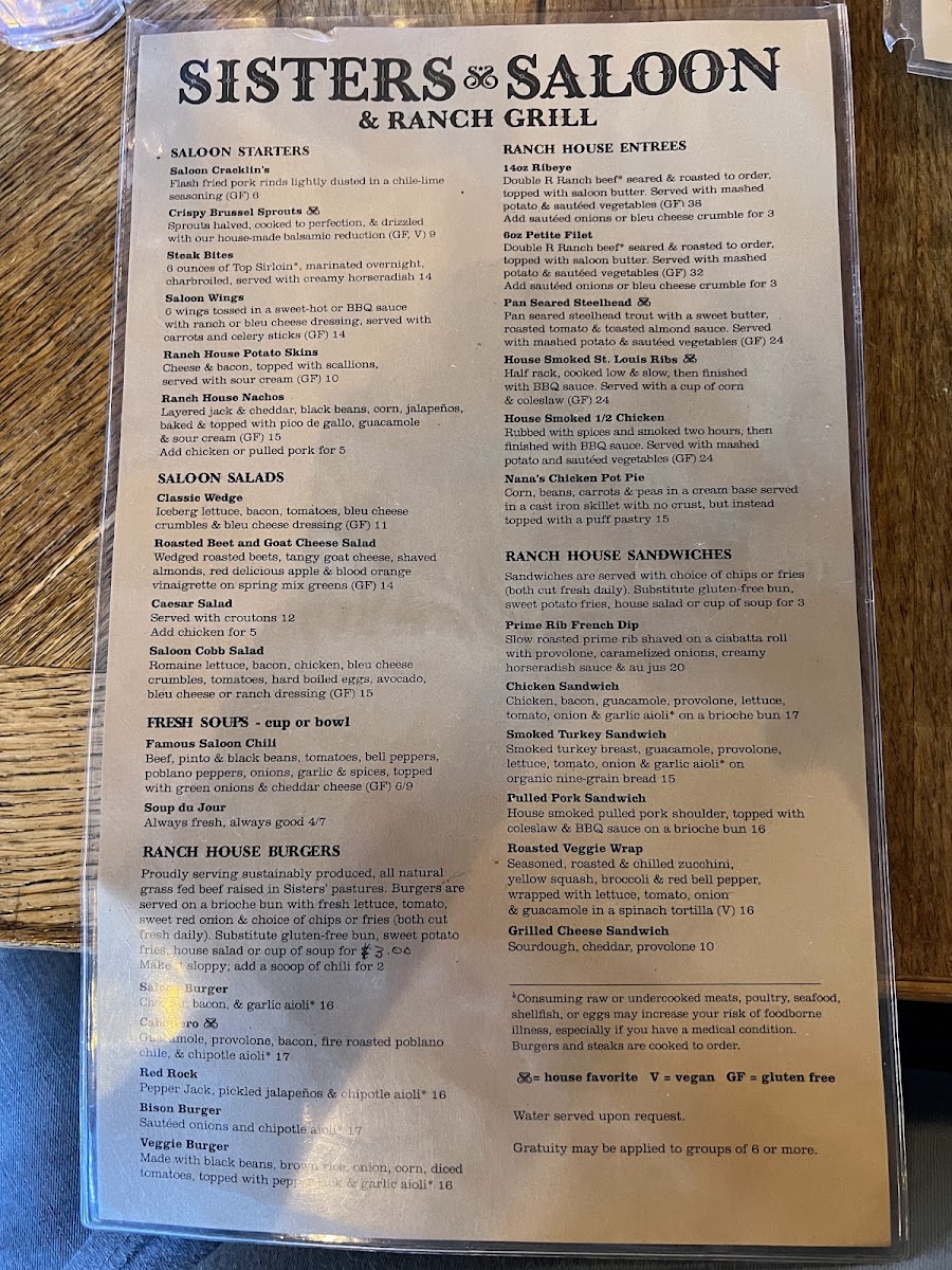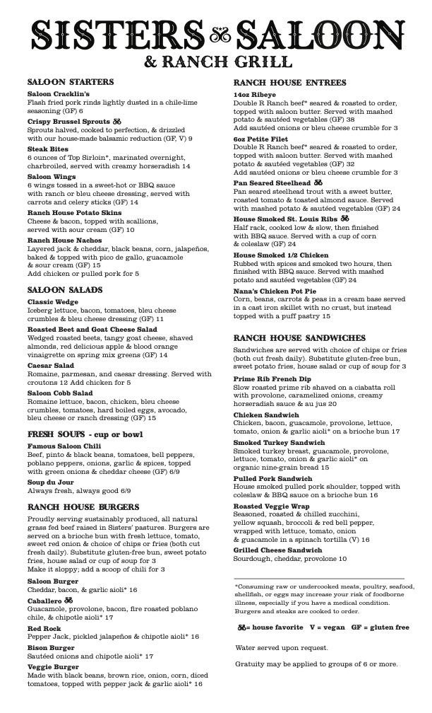 Sisters Saloon & Ranch Grill Menu
