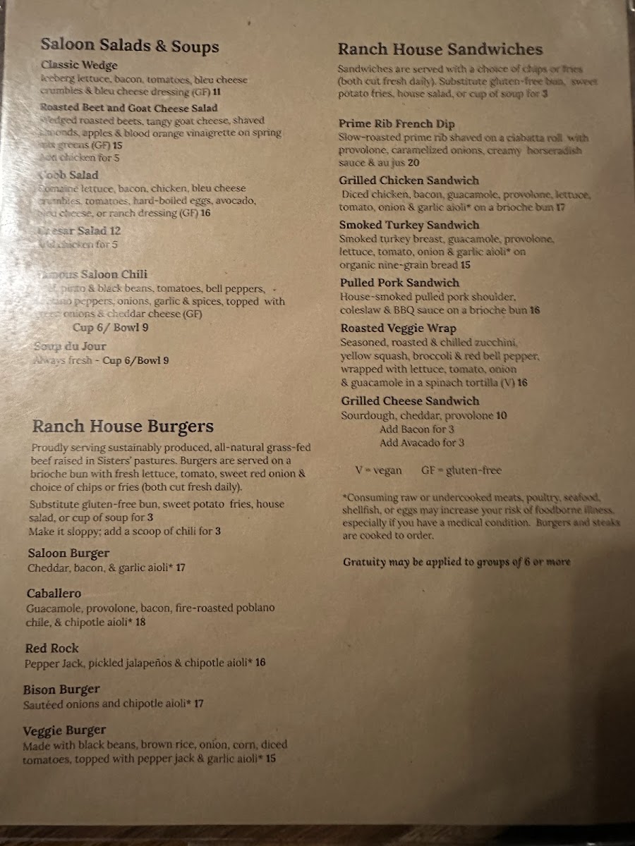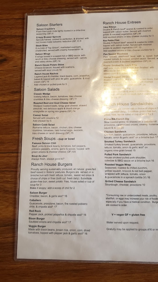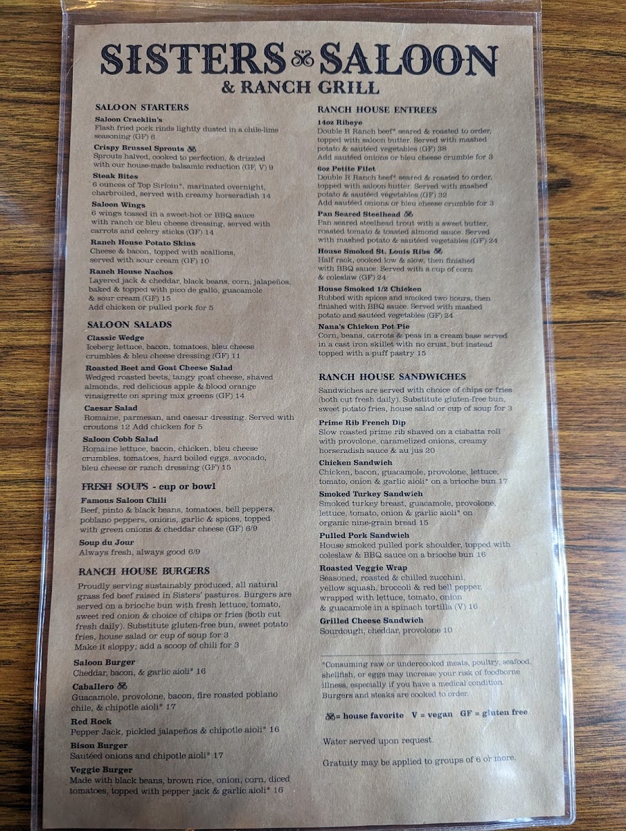 Sisters Saloon & Ranch Grill Menu